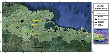Para el estudio se eligieron los generadores de vapor de los centrales azucareros: Loynaz Echavarría, López Peña, Fernando de Dios, Cristino Naranjo y Urbano Noris, ubicados en los municipios Cueto, Báguanos, Cacocum y Urbano Noris, respectivamente (figura 1). Esta zona cuenta, además, con ciudades cercanas altamente pobladas y un polo turístico susceptible de ser afectado por estas emisiones, por lo que la elaboración del inventario de emisiones reviste una gran importancia para evaluar el impacto de las mismas.