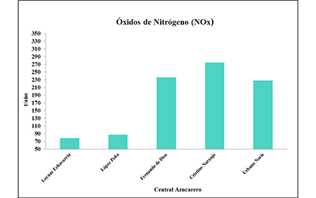 Los contaminantes más emitidos a la atmósfera corresponden al material particulado PM10 y PM2.5, los que representan el 62 y 31% de las emisiones generales, respectivamente, seguido por un 5% de los NOX y el SO2 con el 2% de las emisiones totales (Figura 2). El comportamiento de los contaminantes en los centrales azucareros evaluados se muestran en las figuras 3, 4 y 5, se evidencia que las industrias que más inciden en las emisiones son los centrales azucareros Fernando de Dios, Cristino Naranjo y Urbano Noris, debido al elevado consumo de bagazo utilizado. Con el propósito de evaluar el comportamiento para un año de producción se convirtieron los valores de emisiones a t/año.