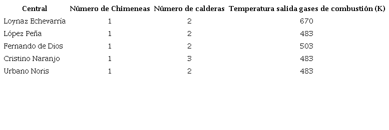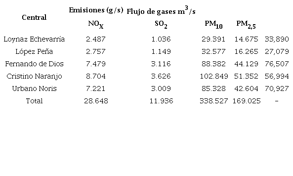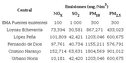 Con el fin de comparar las emisiones con respecto a esta norma, se convirtieron los valores de concentración de los contaminantes a unidades de mg/Nm3. Como resultado se obtuvo que todas las chimeneas sobrepasan los límites normativos para el material particulado PM10 y PM2,5, y en el caso de los NOX sólo los centrales López Peña y Cristino Naranjo superan la norma (Tabla 6).