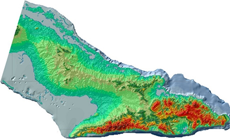 Las tres provincias más occidentales de la región de estudio, Ciego de Ávila, Camagüey y Las Tunas, están constituidas por terrenos predominantemente llanos, con elevaciones que no superan los 443 m de altura, constituida por Sierra de Jatibonico, en Ciego de Ávila. Esta llanura contrasta con los grupos montañosos Nipe-Sagua-Baracoa y Sierra Maestra ubicados en las provincias de Holguín, Guantánamo, Santiago de Cuba y Granma; elevaciones significativas como Pico Real del Turquino con 1974 m de altura en Santiago de Cuba, Pico Bayamesa con 1756 m de altura en Granma y Pico Cristal en Holguín con 1231 m se destacan en esta región (http://www.one.cu). En la figura 1 se puede observar la topografía de la región de estudio.