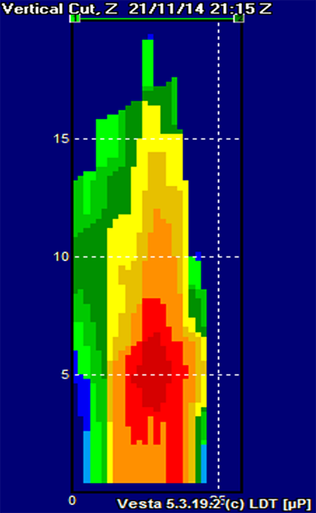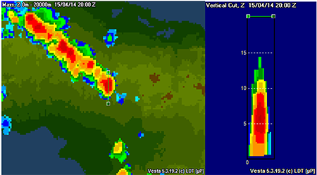 Se comprobó que en 5 de los 6 casos estudiados la lluvia localmente intensa a muy corto plazo fue generada por más de una celda convectiva, las que evolucionaban rápidamente, con un tiempo de vida de las tormentas entre 30 y 60 minutos, aunque en uno de los casos (21 de noviembre de 2014), donde los topes máximos alcanzaron los 19,2 km de altura (figura 9) la tormenta tuvo una duración de más de una hora.