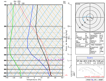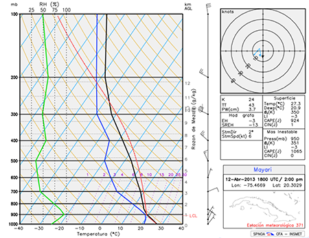 La CAPE fue superior a los 1000 J/kg, más elevada siempre antes de la precipitación, solo en un caso de estudio fue inferior, aunque alcanzó los 930 J/kg. Estos valores de energía son suficientes para generar tormentas convectivas de fuertes corrientes ascendentes, lo que se demuestra con los valores de los topes máximos obtenidos por el radar meteorológico.