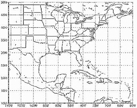El espacio sinóptico está comprendido entre los 10°N-50°N y los 60°W-110°W (figura 2), con una resolución horizontal de 2.5°. Esta área es lo suficientemente amplia para visualizar y analizar las configuraciones y sistemas meteorológicos, tanto de latitudes medias como de la zona tropical, que pudieran influir sobre la región de estudio.