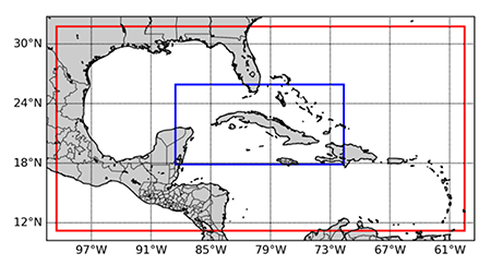 A partir del Sistema de Predicción Numérica Océano Atmósfera (SPNOA) operativo en el Centro de Física de la Atmósfera del INSMET, se analizaron 4 casos de estudio. El SPNOA está conformado por un conjunto de modelos numéricos de última generación (Pérez et al. 2014, Mitrani et al. 2019). Dentro de ellos se utiliza el WRF (Weather Research and Forecasting) en su versión 3.5.1, a partir del cual se realizan pronósticos hasta 72 horas de las principales variables atmosféricas. El WRF es inicializado con la salida numérica de las 0000 y 1200 UTC del modelo global GFS (Global Forecast System), con 0.5 grados de resolución espacial. Cuenta con dos dominios de simulación anidados bidireccionalmente con 18 y 6 km de resolución espacial (ver figura 3), centrados en los 22 grados de latitud Norte y en los 80 grados de longitud Oeste con proyección Lambert Conformal y en la vertical se emplean 30 niveles. En esta investigación se utiliza el dominio de más alta resolución. La configuración física del WRF es: para la radiación de onda larga, RRTM (Mlawer et al. 1997); para la radiación de onda corta, Dudhia (Dudhia, 1989); para la microfísica, se utiliza el esquema de Lin (Lin, Farley and Orville, 1983) y para la formación de cúmulos, es usada Kain-Fritsch (Kain, 2004).