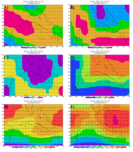 La divergencia fue comúnmente negativa para los niveles de 300, 200 y 100 hPa, el máximo valor es de 12 x 10-5 s-1 aunque suele ser inferior a 8 x 10-5 s-1. En 600, 500 y 400 hPa solo el 12 de abril de 2013 mantuvo valores positivos en todos estos niveles, los demás mostraron un comportamiento muy heterogéneo. Para los niveles inferiores, excepto para 1000 hPa donde existió siempre convergencia y se alcanzó hasta 4.0 x 10-6 s-1, los valores negativos y positivos están divididos en 2 casos de estudio cada uno, y frecuentemente no superaron los 1.0 x 10-6 s-1. El comportamiento de esta variable tampoco mostró un resultado concluyente, aunque se aprecia una relación más clara con lo encontrado por el re-análisis.