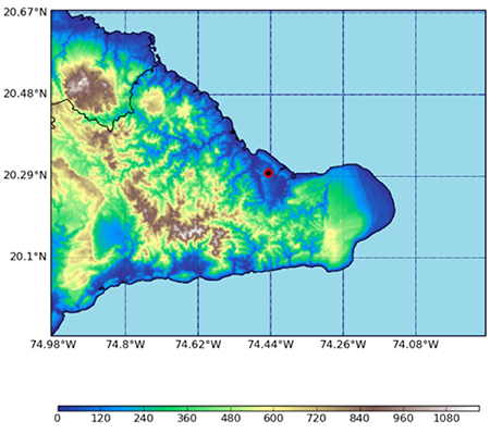 El 15 de noviembre de 2014, la convección no estuvo relacionada con la combinación del frente de brisa con los HCR. Este día la convección, aunque profunda (figura 7a y 7b), se concentró solamente en las inmediaciones de la estación, estimulada, al parecer, por el complejo relieve que rodea a la estación meteorológica de Jamal, Guantánamo (figura 8). Esta situación, unido a la persistencia y el lento movimiento de la celda, propició la ocurrencia de tan importante acumulado (97 mm en 3 horas).