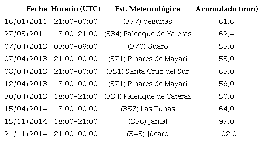 La presente investigación parte del análisis de las observaciones tri-horarias realizadas en el período poco lluvioso desde 2011 al 2013, por las 30 estaciones del servicio meteorológico de Cuba distribuidas en la mitad oriental de este archipiélago. Esta información forma parte de la base de datos que posee el Centro del Clima, Instituto de Meteorología (INSMET). Se seleccionaron solo aquellos días que cumplieran con el requisito de acumulados iguales o superiores a 50 mm en 6 horas o menos.