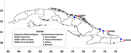 Se emplearon los datos de las estaciones meteorológicas costeras cubanas de Cayo Coco (78339), Cabo Lucrecia (78365) y Punta de Maisí (78369). Además, los mapas sinópticos del nivel de superficie y Estados Generales del Tiempo (EGT) del Instituto de Meteorología (Insmet) y la base de datos sobre ciclones tropicales (HURDAT 2.0) del Centro Nacional de Huracanes de los Estados Unidos radicado en Miami, http://www.nhc.noaa.gov (Landsea & Franklin, 2013). Además, se emplearon los resúmenes de temporada ciclónica elaborados anualmente en el Insmet y diferentes estudios de investigadores cubanos que abordan esta temática (Ortiz, 1973; Ramos, 2009; Insmet, 2012; Pérez, 2013).