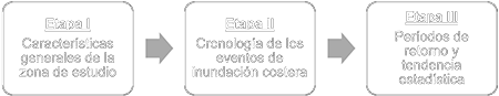 La metodología propuesta cuenta con tres etapas, de las cuales las dos primeras han sido aplicadas por diferentes investigadores cubanos en varias zonas costeras de Cuba (Ramírez et al., 2017; Córdova et al., 2018; Hernández et al., 2019; Regueira & Barcia, 2019), mientras que la tercera está en fase de aplicación a nivel nacional a través del proyecto “Proyección de las inundaciones costeras en el archipiélago cubano” (2018-2021), en el cual participan, además de los autores del presente artículo, más de veinte especialistas e investigadores de todos los Centros Meteorológicos Provinciales y de la Sede Central del Insmet.