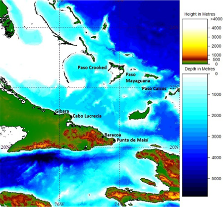 La costa norte de región oriental de Cuba presenta una plataforma estrecha abierta a los vientos del primer cuadrante, particularmente a los del NE-ENE. A través del archipiélago de las Bahamas existen pasos (Crooked, Mayaguana y Caicos) que permiten el tránsito del oleaje con suficiente energía para que la ruptura de este se produzca, libremente, sobre esta parte del país (ver figura 3). En esta zona son propicias las inundaciones costeras por rompiente de oleaje, siendo las ciudades más expuestas Baracoa y Gibara (Hernández et al., 2002; Hidalgo & Mitrani, 2012, 2015; Hidalgo et al., 2017), las cuales en los últimos años se han sido afectadas por eventos de inundación moderados y fuertes asociados al paso de los huracanes Ike (2008), Matthew (2016) e Irma (2017) (Hidalgo et al., 2016, 2017).