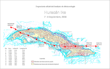 Ike se originó en el seno de una onda tropical en la madrugada del 1° de septiembre del 2008 sobre el Atlántico Central. Se convierte en huracán en la tarde del día 3 y desde esa tarde se intensificó con rapidez pasando a ser un huracán de categoría 3 en la noche a uno de categoría 4 en la madrugada del día 4, con vientos máximos de 230 km/h y una presión mínima de 935 hPa. Tuvo fluctuaciones en su intensidad durante los días 5 y 6 debido a una fuerte cizalladura vertical del viento, sin embrago en la tarde del día 6 alcanzó nuevamente la categoría 4 con vientos máximos del orden de 215km/h. Tocó tierra cubana por las inmediaciones de Cabo Lucrecia, en la provincia de Holguín, a las 2101Z del día 7 de septiembre. Se movió por la zona costera desde de los municipios Banes, Rafael Freyre y Gibara, manteniendo una parte de la circulación sobre tierra y otra sobre el mar, conservando la misma intensidad. Luego continuó su movimiento al Oeste y su centro comenzó a trasladarse por la provincia de Las Tunas en las primeras horas de la madrugada del día 8, con vientos máximos del orden de los 185 km/h como un huracán de categoría 2.