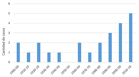 En la figura 7 se muestra el comportamiento por décadas de las inundaciones costeras, en sus tres intensidades, para la ciudad de Gibara donde a partir de la década de los ´80 ocurrieron el 58% de los eventos acontecidos en el período 1900-2018. De las mismas, se puede apreciar un aumento de la frecuencia relativa, la cual es estadísticamente significativa, ya que resultó que al aplicarles la prueba de la proporción. Es de destacar que la mayor inundación costera ocurrida en la Villa Blanca holguinera ocurrió al paso del huracán Ike (2008).