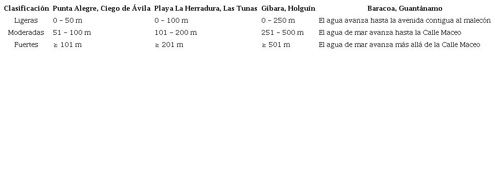 Para la clasificación de las inundaciones costeras se empleó la tipificación propuesta por (Hidalgo et al., 2017) para los diferentes asentamientos costeros del territorio cubano que reportan este tipo fenómeno meteorológico extremo.