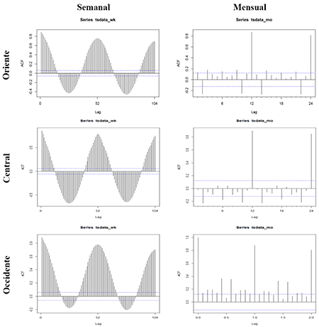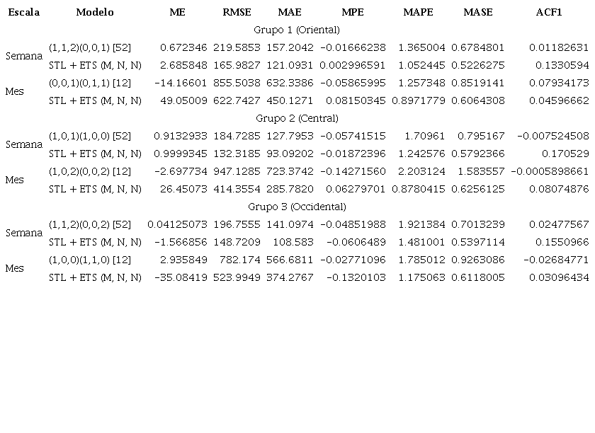 En la Tabla 4 aparecen los estadísticos obtenidos para cada uno de los modelos ARIMA y STL. Los estadísticos Raíz del Error Cuadrático Medio (RMSE), el Error Medio Absoluto (MAE) y el Error Medio Absoluto Porcentual (MAPE), miden la magnitud de los errores, o sea, el mejor será el que muestre el valor más pequeño; y el Error Medio (ME) y el Error Medio Porcentual (MPE) miden el sesgo estadísticamente y se considera que el mejor modelo da un valor próximo a 0 (Sánchez, 2013). Otro criterio lo dan Sánchez y Poveda (2006), para quienes el desempeño de los modelos se evalúa para todas las series mediante el error cuadrático medio (RMS). Sobre los correspondientes en este análisis, tanto para la escala semanal como mensual, se observa que el de mejor ajuste corresponde al grupo oriental: (1,1, 2)(0,0,1)52 y (0,0,1)(0,1,1)12.