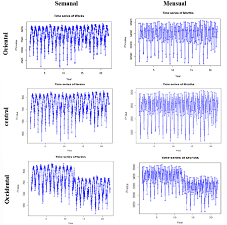 Se aplicaron técnicas exploratorias para la identificación de patrones y para ello, los datos fueron divididos y a partir de esto, se crearon series temporales como sigue: