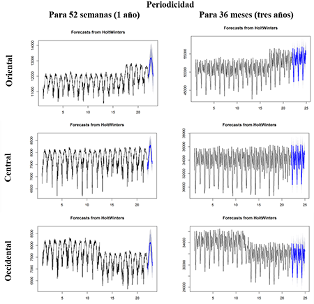 Los resultados de la aplicación del pronóstico automático mediante suavizado exponencial (método Holt Winters), tanto para la escala semanal como mensual, aparecen en el panel representado en la Figura 3. Para el primer lapso la predicción se realizó para 52 semanas (un año); mientras que en el segundo, se determinó usar 36 meses (tres años).
