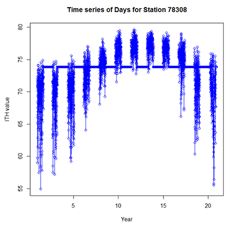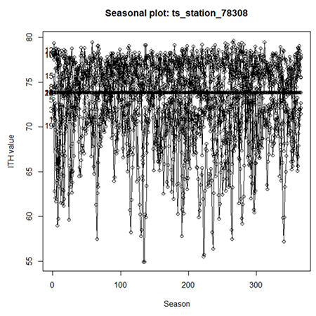 Se adicionaron los datos diarios, semanales y mensuales para conformar series de tiempo de la suma de valores de ITH. Para el ajuste de la serie de tiempo semanal, primeramente se truncaron los primeros y últimos registro de las series y se asignaron los nuevos valores de principio y fin.