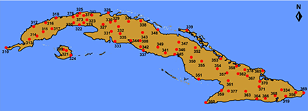 La base de información para el estudio lo constituyen los registros de código de estado de tiempo presente y pasado para 68 estaciones meteorológicas del territorio cubano, en el periodo 2005 - 2016 (12 años) que se encontró, es el periodo con información más completa para ambos códigos, donde no hay sesgos ni mensuales ni horarios y las series son más actuales (Álvarez - Escudero et al., 2019 [en prensa]). Los datos fueron tomados de la Base de Datos “Nueva_THOR” (Álvarez et al. 2012) a la que se le agregaron los registros correspondientes al periodo 2011 - 2016, obtenidos de la Base de Datos del Centro del Clima del Instituto de Meteorología (INSMET), a los que se le realizaron las debidas validaciones para lograr la uniformidad de la información. La distribución espacial de las estaciones meteorológicas se refleja en la figura 1.