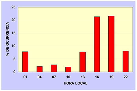 Debido a la incidencia que el fenómeno “tormenta eléctrica” tiene sobre la vida de las personas y sobre diferentes sectores de la economía, los estudios que caracterizan su marcha diaria presentan especial interés. Para planificar actividades al aire libre o conectar sistemas de protección se precisa un conocimiento sobre qué hora u horas del día son aquellas en que las tormentas son más frecuentes.