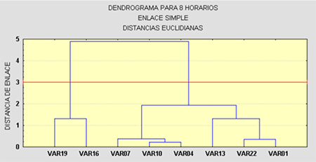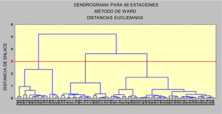 A partir del por ciento de ocurrencia o número de días por meses para cada una de las 68 estaciones en estudio, se realizó un análisis de cluster jerárquico mediante la evaluación de un dendrograma que considera a las estaciones como variables y a los horarios como individuos. Aquí se utilizaron distancias euclidianas y método de enlace simple para identificar agrupamientos por horas del día en el comportamiento de la marcha diaria. Posteriormente se realizó otro análisis de cluster tomando los valores horarios como variables y las estaciones como individuos y también se usaron distancias euclidianas, pero como método de enlace el método de enlace de varianza mínima o método de Ward, (en cada paso de enlace se exige la unión de grupos que minimicen la suma de las varianzas sobre todos los grupos) que es un método muy robusto para encontrar asociaciones entre grupos, lo que permitió una mayor definición de las asociaciones que se formaban. La distancia de enlace asumida para la diferenciación de grupos se escogió tal que la distancia entre elementos de un mismo grupo sea menor que la distancia entre grupos o clusters.