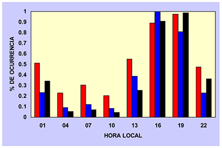 La marcha diaria de las tormentas ha sido estudiada a partir de registros de estaciones de superficie (OMM, 1956; Changnon, 1988; Dai, 2001a; 2001b) y en la actualidad se existen trabajos realizados con información de dispositivos detectores de tormentas y con datos de satélites (Orville et al., 2002; Virts et al., 2013; Cecil et al., 2014; Albrecht et al., 2016). Todos los estudios coinciden que la mayor ocurrencia se concentra en horas de la tarde.
