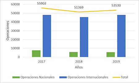 Del análisis de la base de datos de operaciones aéreas, se obtuvo que en el aeródromo operaron 244 tipos de aeronaves entre el 2017-2019, dando un total de 160801 operaciones (figura 1). El 2017 fue el año con más operaciones, en el 2018 se produjo una ligera disminución, causado fundamentalmente por el accidente aéreo del 18 de mayo de una aeronave Boeing 737-200 de la compañía mexicana Global, que cubría la ruta Habana - Holguín. En el año 2019 hubo un aumento en las operaciones, con respecto al año anterior, pero quedando por debajo del 2017 en más de 2000 operaciones, debido a la disminución de los vuelos de compañías de origen estadounidense, causado por las medidas impuestas por el presidente de dicho país.