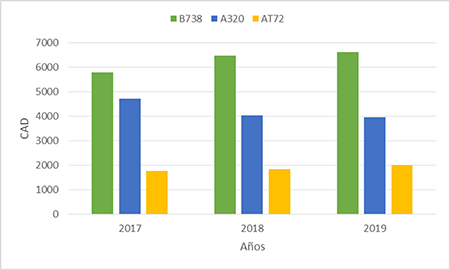 Las aeronaves con mayor número de CAD (figura 3) fueron el B738, el A320 y el AT72, cubriendo entre ellas el 46.27% de los ciclos realizados.