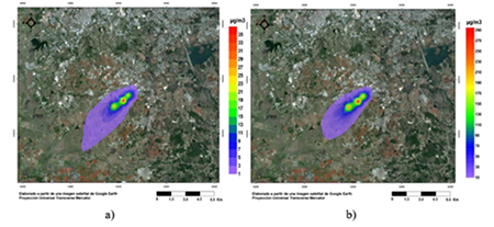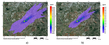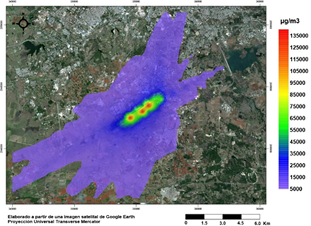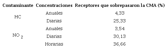 Las veces que se superó la CMA (tabla 2) fueron aumentando a medida que el contaminante llevaba menos tiempo en la atmósfera, en concordancia con que los mismos desaparecen con el paso del tiempo, por eso las veces en que se excede la CMA en los promedios anuales es muchísimo menor que las que ocurren en los diarios y horarios. El total de receptores afectados superó el 25% en los análisis realizados para las concentraciones horarias y diarias, por lo que se debería de llevar a cabo un programa de monitoreo ambiental y elaborar medidas para disminuir las afectaciones que se puedan producir en la salud humana y el medio ambiente.