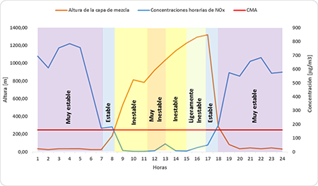 Se observa entre las 8 y las 17 horas, el predominio de condiciones inestables y un aumento de la altura de la capa de mezcla, con un pico máximo a las 17 horas, lo que propició una mayor dispersión de los contaminantes y, por consiguiente, la disminución de las concentraciones de NO2. Las CMA fueron sobrepasadas en dos periodos del día, de 1 a 8 horas, así mismo de las 18 a las 24 horas, donde ocurrieron condiciones estables, y la altura de la capa de mezcla disminuyó considerablemente e impidió la dispersión, propiciando un aumento en las concentraciones, las que alcanzaron los mayores valores en horas de la madrugada.