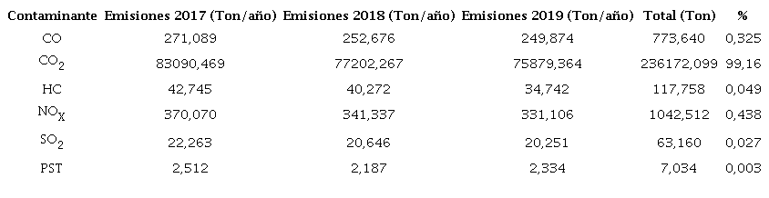 Las emisiones evidenciaron una tendencia a disminuir durante el período de estudio (tabla 1), debido al el decrecimiento de los CAD; exceptuando el caso de las partículas suspendidas totales (PST), donde se produjo un aumento en el año 2019, producto de la entrada de aeronaves que emiten mayores toneladas de este contaminante en dicho año, como el Il-62, que posee el mayor factor de emisión para las PST. Los contaminantes que más emitieron las aeronaves son el CO2, los NOX y el CO, cada uno con más de 700 toneladas en total; se destaca el caso del CO2, que representa más del 99% de las emisiones, resultado similar fue obtenido por Lee et al. (2008), mientras que, los restantes contaminantes ocuparon menos del 0.5% cada uno.
