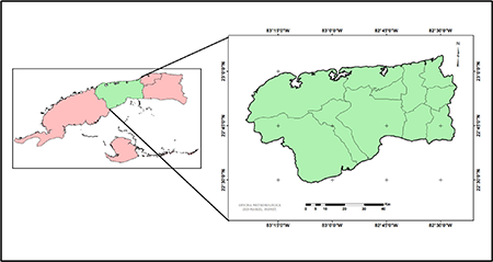 La provincia de Artemisa está ubicada en la región occidental de Cuba entre 22°29’, los 23°05’ de latitud norte y los 83°25’, 82°28’ de longitud oeste. Limita al norte con el estrecho de la Florida, al sur con el golfo de Batabanó, al este con las provincias de la Habana y Mayabeque y al oeste con la provincia de Pinar del Río (figura 1).