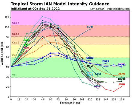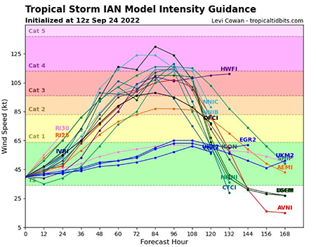 Para el 24 de septiembre de 2022 los modelos de pronóstico y el cono de trayectoria insistían en que este organismo ciclónico se movería sobre el occidente del país (figura 5) y según los modelos de intensidad mostraban un proceso de rápida intensificación en un ambiente muy favorable para su desarrollo (figura 6), con altas probabilidades de que Cuba seria azotada por un huracán de gran intensidad (categoría 3 en la escala Saffir- Simpson). De acuerdo a la trayectoria pronosticada y teniendo en cuenta las simulaciones de los distintos modelos de predicción, se pronosticaba un deterioro gradual de las condiciones del tiempo para la tarde-noche del lunes 26 de septiembre de 2022, comenzando por la Isla de la Juventud y extendiéndose paulatinamente al resto de las provincia occidentales y centrales.