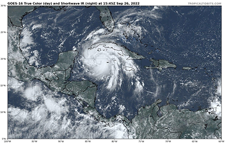 Durante la mañana del 26 de septiembre cerca de las 7:00 am continúo ganando en organización e intensidad convirtiéndose en el cuarto huracán de la actual temporada ciclónica con vientos máximos sostenidos de 120 km/h y una presión mínima central de 981 hPa (figura 11). Se encontraba localizado a los 18.7 ºLN y 82.4 ºLW a 440 km al sudeste del Cabo de San Antonio con un movimiento hacia el noroeste a 22 km/h. El radio de los vientos con fuerza de huracán se extendía a 30 km/h desde el centro de circulación y los de tormenta tropical hasta 150 km/h. Las bandas externas de chubascos y tormentas eléctricas se situaban a varios cientos de km del centro del sistema