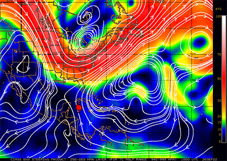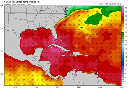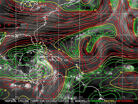 En su avance sobre el mar Caribe la tormenta tropical Ian continúo ganando en organización e intensidad y su patrón nuboso se estructuraba mejor en su movimiento hacia el noroeste, con una disminución en su velocidad de traslación las condiciones seguían favorables para su desarrollo ciclónico. Este sistema se estuvo moviendo sobre aguas muy cálidas, con temperaturas superficiales del mar de 30 ℃ o superiores (figura 7), que en combinación con débiles vientos en la altura (figura 8) y el alto contenido de humedad, permitieron un continuo fortalecimiento del sistema e incluso un proceso de rápida intensificación.