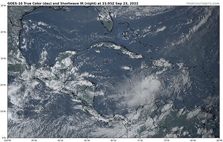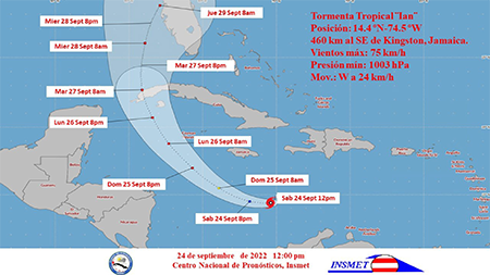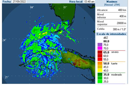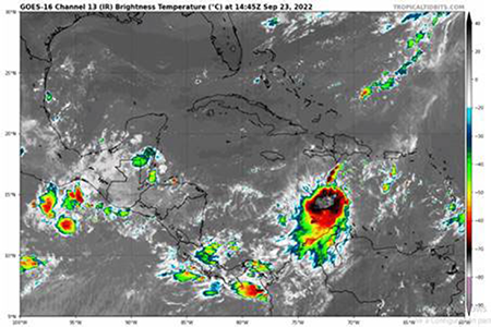 En la mañana del 23 de septiembre cerca de las 11:00 am las condiciones atmosféricas continuaban siendo favorables por lo que siguió ganando en organización e intensidad y se convierte en la Tormenta Tropical Ian con vientos máximos sostenidos de 65 km/h con rachas superiores (figura 4).