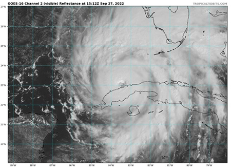 En la tarde del 27 de septiembre, Ian se encontraba al sudeste del Golfo de México y continuaba ganando en organización e intensidad. A las 3:00 pm los vientos máximos sostenidos de este sistema habían aumentado a 195 km/h y presentaba una presión mínima central de 952 hPa. Aunque Ian se alejaba paulatinamente del territorio cubano, las áreas de nublados y lluvias, así como la persistencia de los intensos vientos continuaron afectando gran parte del occidente cubano y favorecieron fuertes marejadas en ambas costas occidentales.