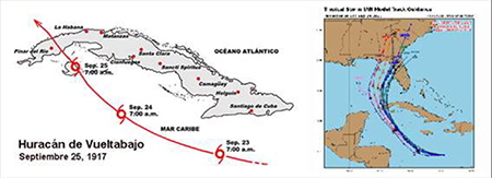 Según el profesor Luis Enrique Ramos Guadalupe, coordinador de la Comisión de Historia, de la Sociedad Meteorológica de Cuba el huracán Ian amenaza al occidente cubano a finales del mes de septiembre coincidiendo unos 105 años atrás, el 25 de septiembre de 1917 cuando la Isla de Pinos y la provincia de Pinar del Río fueron arrasadas por un violento huracán categoría 4 (figura 15).En principio, la temporada de 1917 había resultado benigna, con solo dos tormentas tropicales que se movieron lejos de Cuba. Pero esa relativa tranquilidad se esfumó a finales de agosto, cuando el océano y la atmósfera se acoplaron mejor y aparecieron dos intensos huracanes en septiembre. El primero de ellos alcanzó vientos de 190 km/h (SS-3) sobre aguas del Atlántico; mientras el segundo, surgido el día 20 en un área de mal tiempo próxima al extremo sur de las Antillas Menores, casi igual que Ian, se enrumbó hacia el Caribe y apuntó al Canal de Yucatán, aproximándose a 15 km/h.