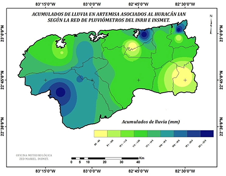 Para el análisis del comportamiento de las variables meteorológicas durante el paso del Huracán Ian se utilizó los datos de los acumulados de las lluvias brindados por la red de pluviómetros del Instituto Nacional de Recursos Hidráulicos y las estaciones meteorológicas de la provincia: Bahía Honda (318), Bauta (376), Güira de Melena (320) y la estación automática de Mariel así como los datos de presión, fuerza y dirección del viento de dichas estaciones. Los datos de lluvias sirvieron para confeccionar el mapa de los acumulados durante el paso del huracán Ian en la provincia, aunque es válido señalar que por parte del Instituto Nacional de Recursos Hidráulicos solo se contó con la información de los embalses del territorio. Para la representación espacial se utilizó el método de interpolación del inverso de la distancia ponderada (IDW).