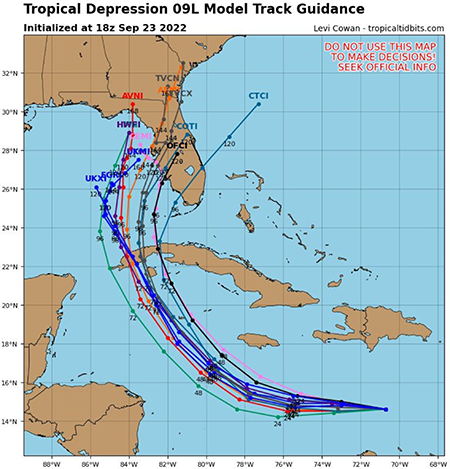 Durante la noche y madrugada del día 23 de septiembre, esta activa onda tropical continuó ganando en organización convirtiéndose en la depresión tropical Nueve de la actual temporada ciclónica en los mares al norte de Venezuela (figura 2), con vientos máximos sostenidos de 55 km/h con rachas superiores y una presión mínima central de 1006 hPa moviéndose a un rumbo próximo al oeste-noroeste a razón de 20 km/h. Los modelos de trayectoria mostraban una elevada probabilidad de impacto sobre la mitad más occidental de nuestro país (figura 3).