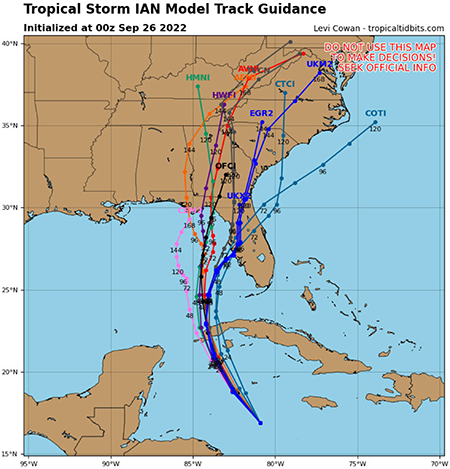 En la noche del 25 de septiembre alrededor de las 11:00 pm Ian había alcanzado vientos máximos sostenidos de hasta 100 km/h, con una velocidad de traslación de 20 km/h. El radio de los vientos con fuerza de tormenta tropical se extendía hasta los 110 km desde el centro de circulación de la tormenta. Los modelos de trayectoria desplazaban su trayectoria algo más hacia el este sobre la provincia de Pinar del Rio, específicamente por la ensenada de Cortés (figura 9) y continuaban los modelos de intensidad insistiendo en que Cuba seria azotada por un huracán de gran intensidad (figura 10).