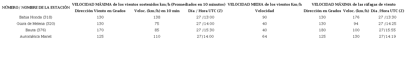 Se registraron vientos con fuerza de huracán en el extremo occidental de la provincia, específicamente en los municipios de Bahía Honda y San Cristóbal, la estación meteorológica de Bahía Honda reportó vientos máximos sostenidos de 138 km/h y una racha de 176 km/h a las 09:30 am, hora local. En la estación automática de Mariel se registró vientos máximos sostenidos en la categoría de tormenta tropical fuerte de 110 km/h, con rachas de vientos huracanados de 130 km/h a las 10:19 am, hora local (figura 16). En el resto del territorio se reportaron vientos de tormenta tropical, con vientos máximos sostenidos entre los 75 y 85 km/h (tabla 1).