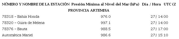 La presión atmosférica al paso del huracán Ian (tabla 2) descendió y alcanzó valores entre los 986.6 y 976.0 hPa en el extremo occidental del territorio, siendo la más baja en la estación meteorológica de Bahía Honda con 976.0 hPa.
