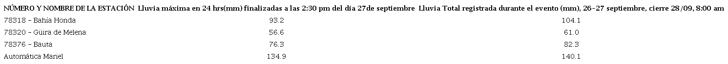 Según la red de estaciones meteorológicas de la provincia el mayor acumulado estuvo en la Estación Meteorológica Automática de Mariel con 140.1 mm, seguido de la estación meteorológica de Bahía Honda con 104.1 mm, el resto de las estaciones de la provincia registraron precipitaciones entre 60 y 85 mm (tabla 3)