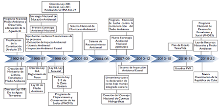 Los temas de la gestión costera siembre han sido de gran relevancia para Cuba. Muchas han sido las acciones, planes, programas, estrategias, instrumentos jurídicos, programas de estudios, etc. creados con el objetivo de promover el desarrollo sostenible de la zona costera. A continuación se refieren momentos importantes que reflejan la intencionalidad gubernamental por el cuidado y protección del medio ambiente (Figura 1):