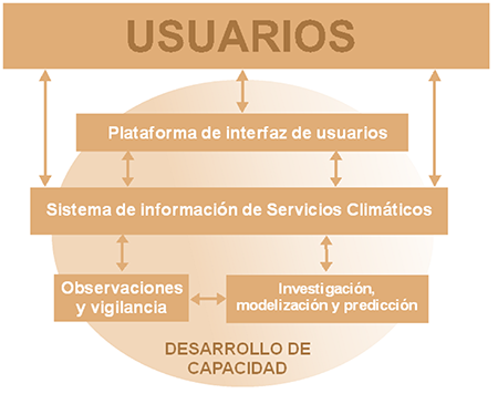 Aquellos países con más vulnerabilidad ante los peligros climáticos y ambientales tienen en el MMSC una gran oportunidad para mejorar el bienestar, su contribución al desarrollo, la reducción de riesgos de desastre, la adaptación al cambio climático y la atenuación de sus efectos en las poblaciones más vulnerables. Ninguno de estos logros podrá alcanzarse sin el desarrollo continuado de capacidades y competencias a nivel mundial, regional y nacional. Estos servicios climáticos pueden ser a corto, mediano y largo plazos (días, semanas, meses y años) por lo que las decisiones operativas pueden ser más eficientes cuando se tienen en cuenta las informaciones climáticas haciendo uso de la base de datos históricos e informaciones sobre las predicciones de las variaciones climáticas. Las decisiones a largo plazo sobre la adaptación al cambio climático futuro y la atenuación de sus efectos también pueden sustentarse mejor cuando se consultan las proyecciones sobre los efectos del cambio climático.