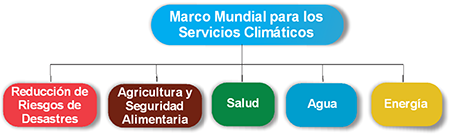 Existen muchos sectores sensibles a las condiciones climáticas, el MMSC desde su creación comenzó a trabajar en cinco áreas prioritarias (Figura 3), entre ellas la agricultura y la seguridad alimentaria, reducción de riesgo de desastre, salud, agua y la energía las cuales son vulnerables a los efectos del cambio climático, como se vio en los ejemplos anteriores. No obstante, existen otros sectores donde la implementación de los servicios climáticos ha comenzado a dar los primeros pasos, como los ecosistemas y medio ambiente, los océanos y litorales, el transporte y el turismo y las megaciudades, reforzando la información para que los usuarios los utilicen en la planificación de sus actividades socioeconómicas y para fines operativos.