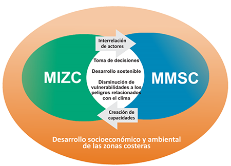 Asimismo, el MIZC le provee al MMSC las herramientas para el lograr el vínculo entre usuarios y proveedores del servicio climático y eliminar las brechas entre ambos, ya que como enfoque participativo y multidisciplinario; el MIZC favorece el vínculo entre los principales actores de la zona costera (comunidad, gobierno, ciencia, administraciones).