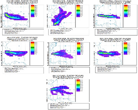 En las dispersiones analizadas se puede observar la llegada de la pluma de cenizas y demás contaminantes expulsados hasta el norte de África y el Caribe, coincidentemente con los modelos de trayectoria anteriormente presentados para este caso, en direcciones Este-Oeste mayormente.