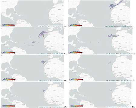 De la plataforma Copernicus, captadas por el sensor Tropomi del satélite Sentinel 5P, se obtuvo la densidad de la columna de dióxido de azufre expulsada por el volcán Cumbre Vieja. Fueron analizados los días 19 de septiembre (Figura 10.a), 26 de septiembre (Figura 10.b), 1 de octubre (Figura 10.c), 8 de octubre (Figura 10.d), 1 de noviembre (Figura 10.e), 8 de noviembre (Figura 10.f), 1 de diciembre (Figura 10.g) y 8 de diciembre (Figura 10.h).