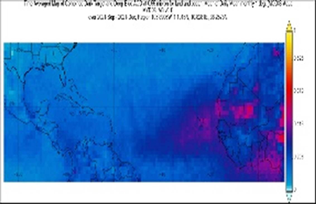 En la Figura 11, de la plataforma Giovanni NASA se puede apreciar el espesor óptico (AOD) captado por el sensor Modis del satélite Aqua, entre los meses septiembre 2021 a diciembre 2021. En ellas resalta la dispersión provocada por una nube de polvo del Sahara en estos meses.